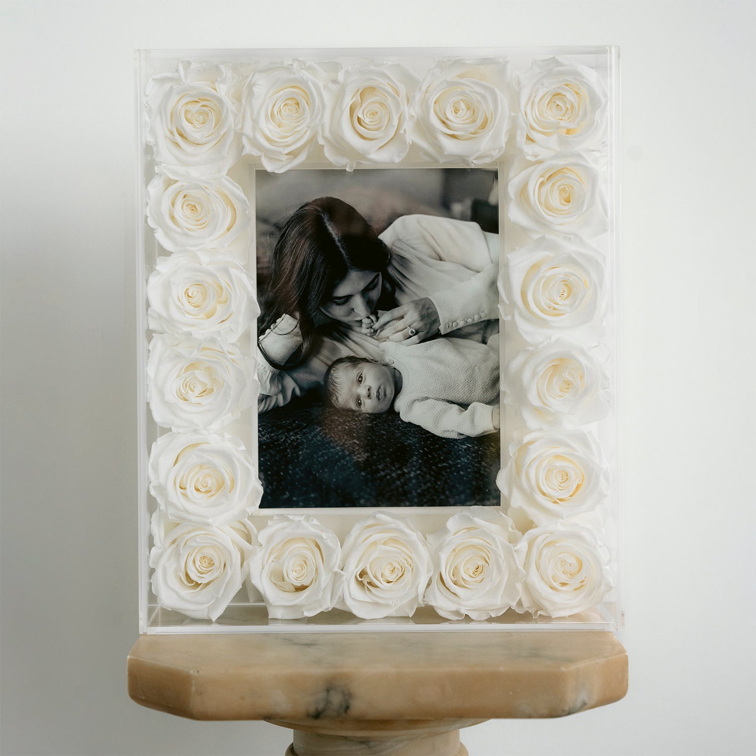 Introducing the Fleur Frame, a stunning picture frame adorned with eternity roses. The first of its kind, this picture frame is a true statement piece in the realm of home decor. This quality frame is designed to hold 5" x 7" photos, making it the perfect way to showcase your most cherished memories. With its secure clips, swapping out photos is effortless, making the Fleur Frame practical and elegant. The frame can either be displayed on the wall or sit flat on a surface, adding a touch of glamour to any room in your home. Ideal for any occasion, from Valentine's Day to birthdays and beyond, this frame is a must-have for anyone seeking a blend of luxury and functionality.