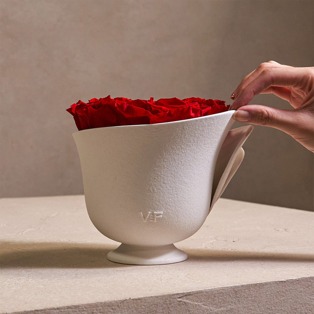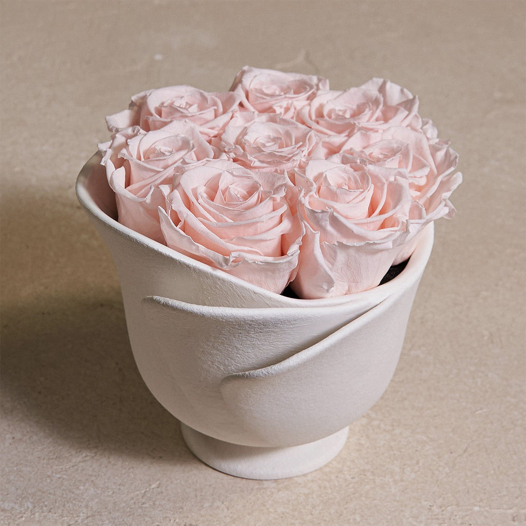 Our handcrafted Mojave Petal Arrangement is a testament to nature's artistry. Its form mirrors the delicate unfurling of petals, each contour meticulously sculpted at the vase's opening. Nestled within are our timeless eternity florals, paying homage to the enduring wildflowers that flourish in the Mojave desert.