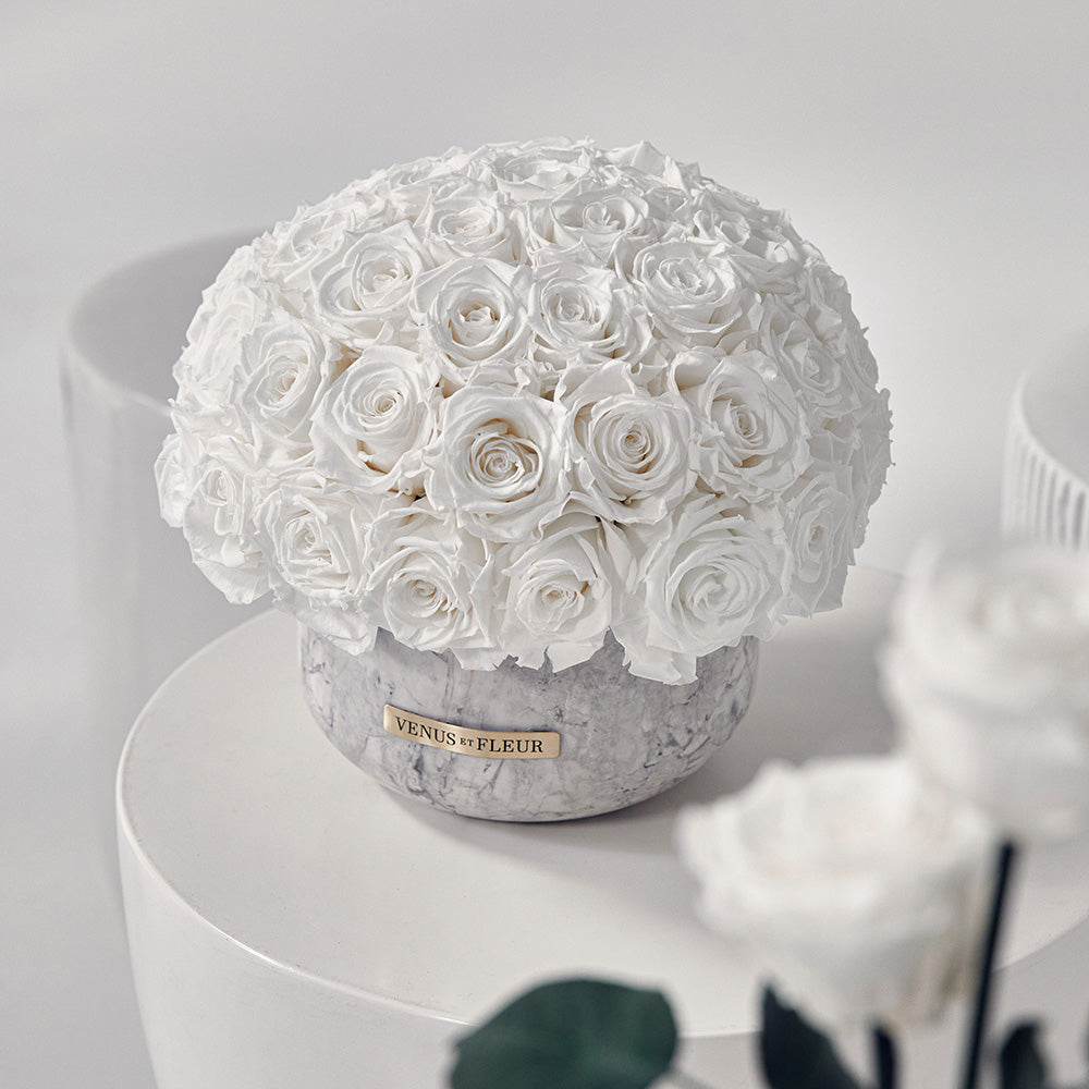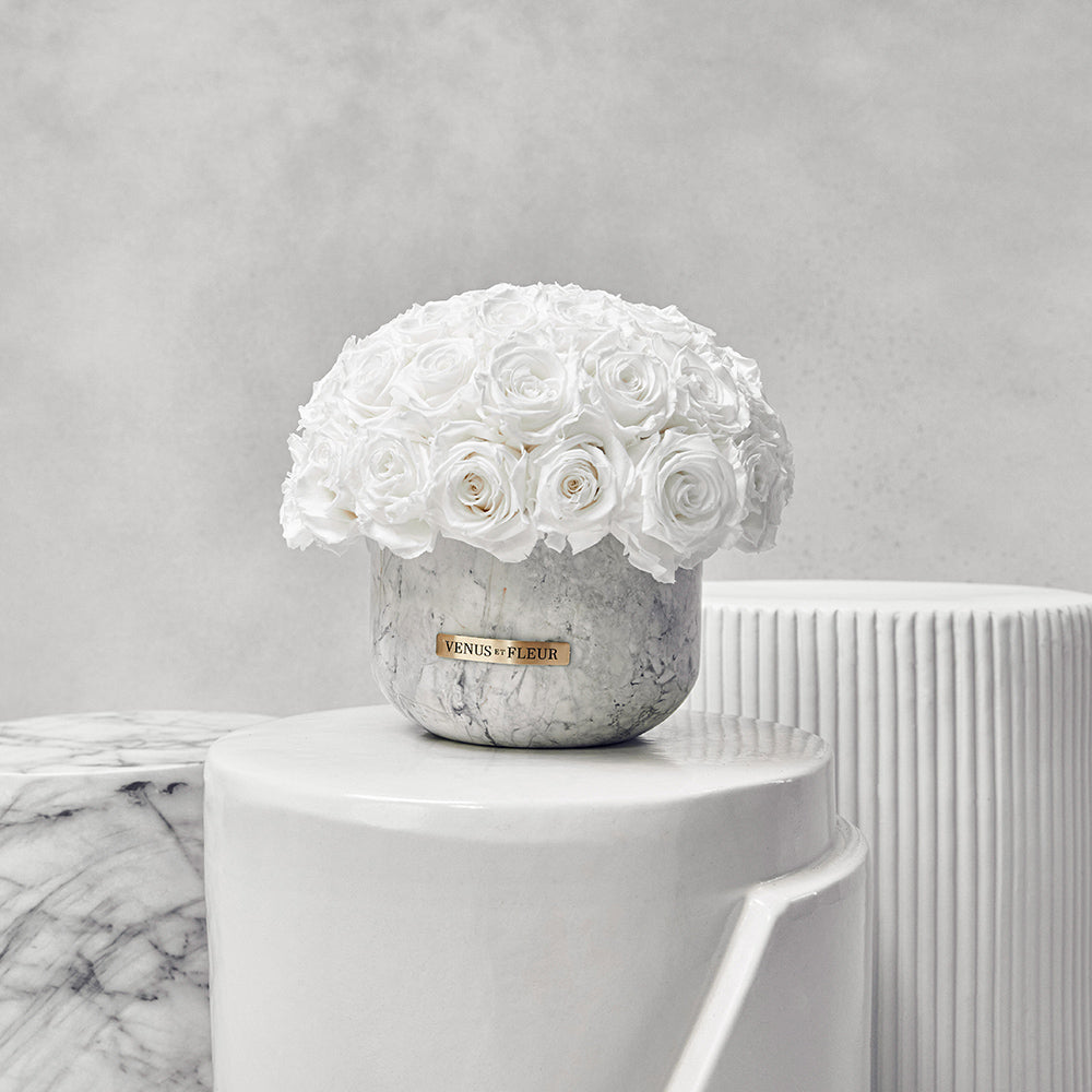 A gorgeous arrangement of over 50 Eternity® Roses mixed with hedera leaves in a dome shape and set in a stunning gray marble stone vase. This unique vase is masterfully carved from a single block of marble and is inspired by the popular Terre Travertine Vase from our beloved Elements collection.