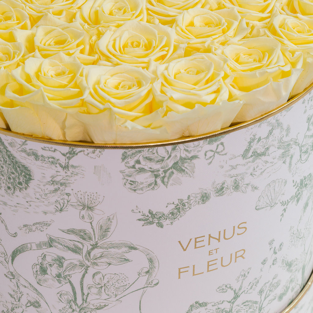 Our signature Parisian hatbox is re-imagined for the season with the exclusive Toile du Joie print—adorned with delicate gold accents and featuring a hand-drawn illustration created exclusively for Venus et Fleur. The intricate toile pattern is rich with symbolism inspired by the goddess Venus, weaving a story of beauty, strength, and devotion. A refined statement piece, this preserved floral arrangement brings enduring beauty to any space, with a presence that lasts far beyond Mother’s Day.